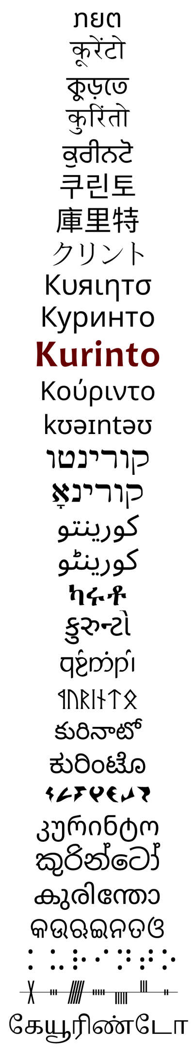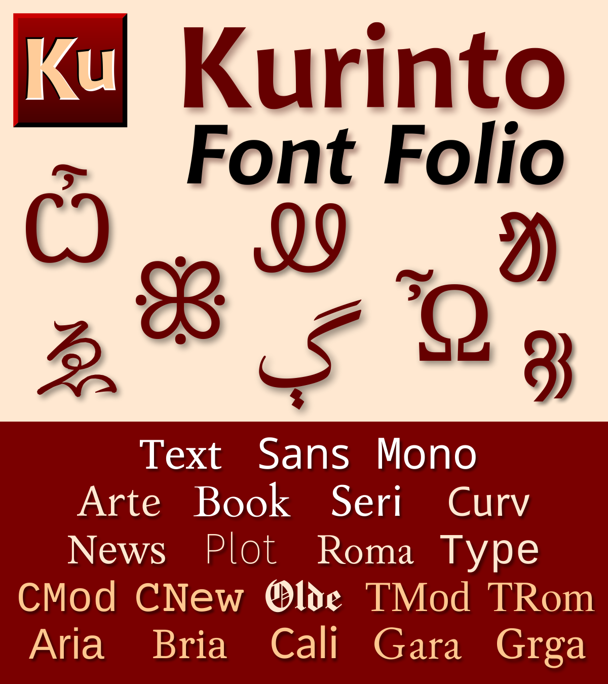 The stack of words on the upper-right are transliterations of “Kurinto”. I used Google Translate for many of them and assembled others based on Unicode character titles. The word stack (as well as this web page) are set in Kuirnto Sans, with Kurinto Curv Bold used for the items in Maroon.